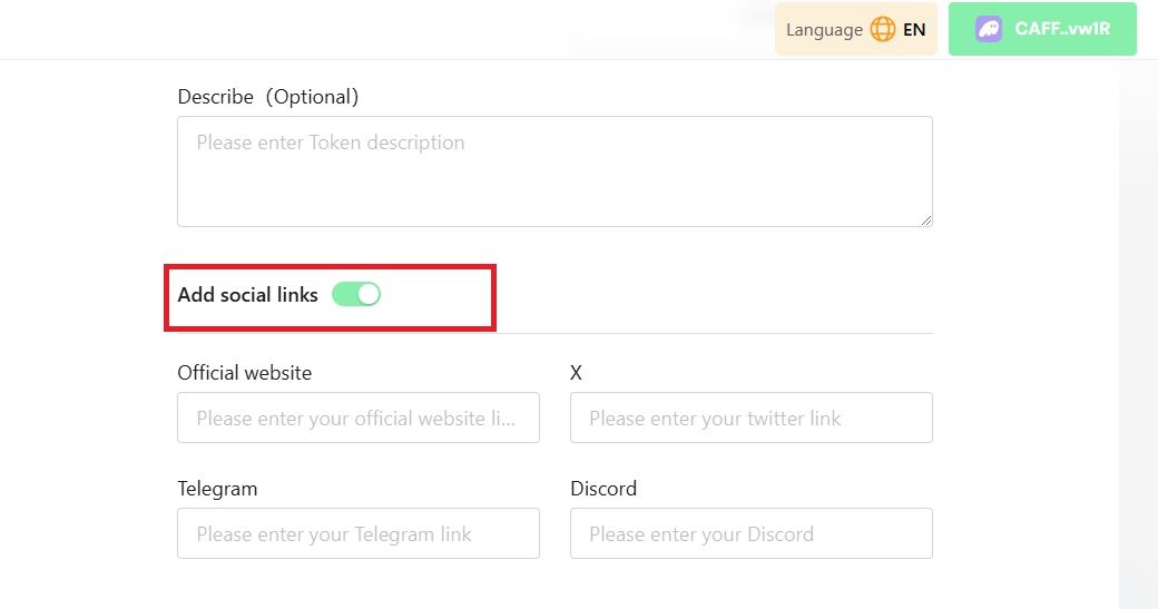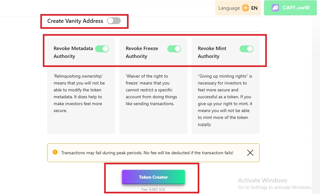 Note: There’s an option to add social links for Token website and social media URLs. Click on “Upload Metadata”. After Metadata is uploaded successfully, enter token decimal and token supply. Next is to enable “Revoke Freeze Authority”, “Revoke Mint Authority” and “Revoke Metadata Update Authority” before clicking on “Create Token” button.